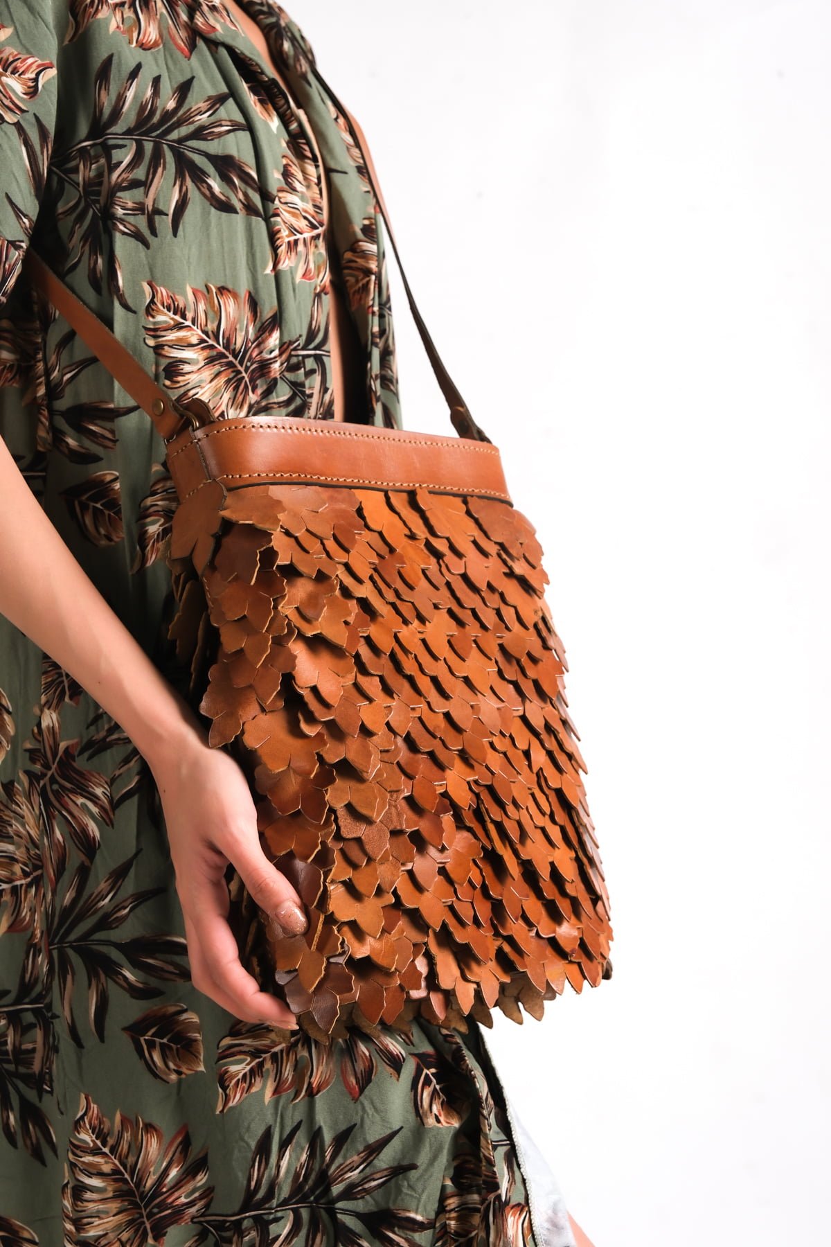 YAPRAKLI ÖZEL TASARIM HAKİKİ DERİ & EL YAPIMI OMUZ ÇANTASI